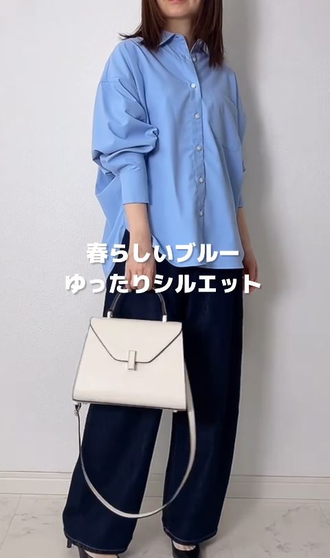 ボトムスには濃紺のワイドデニムを合わせ、シャツの裾をふんわりとインすることで、重心が上がって脚長効果も期待できます。小物はきれいめな白いハンドバッグと黒のパンプスをセレクト。カジュアルなデニムスタイルに品の良いアクセントを添え、全体をバランスよく引き締めています。シンプルながらも配色とシルエットにこだわった、春の街歩きにぴったりなスタイルです。