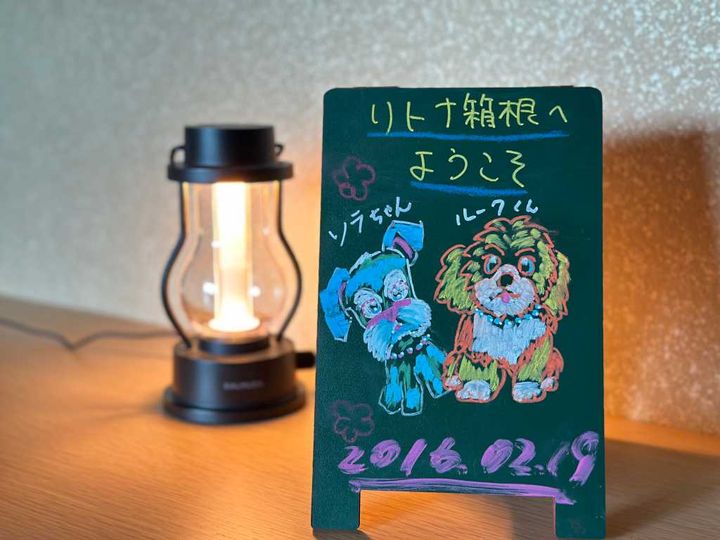 お部屋には愛犬たちの名前とイラストが描かれたウェルカムボード