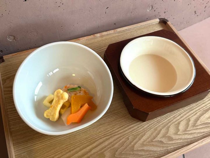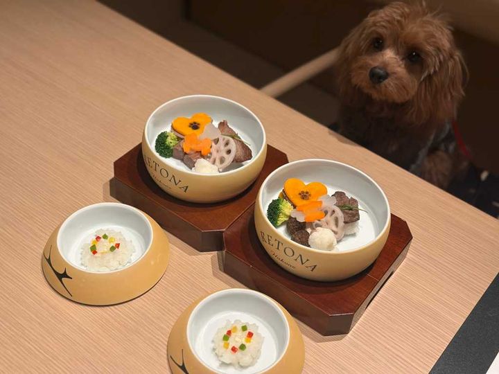一方、愛犬用の食事も充実。ペット栄養管理士資格を持つ料理長が監修した特別メニューが用意され、メイン料理やリゾット、デザートなど本格的な料理を楽しむことができます。