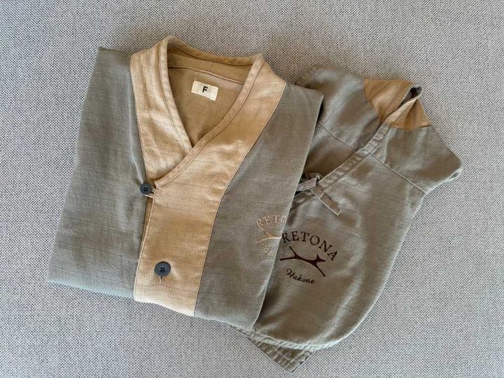 オリジナルの館内着。飼い主と同じものをワンちゃんサイズに仕立てた特別な1着は、記念撮影必須!