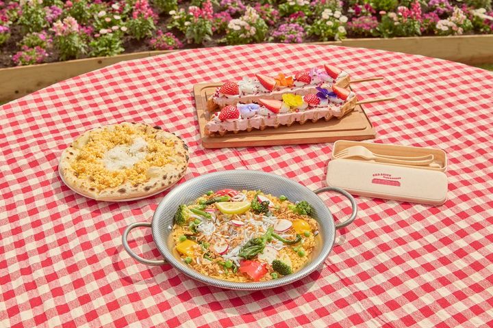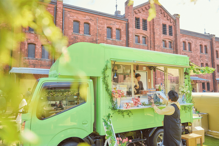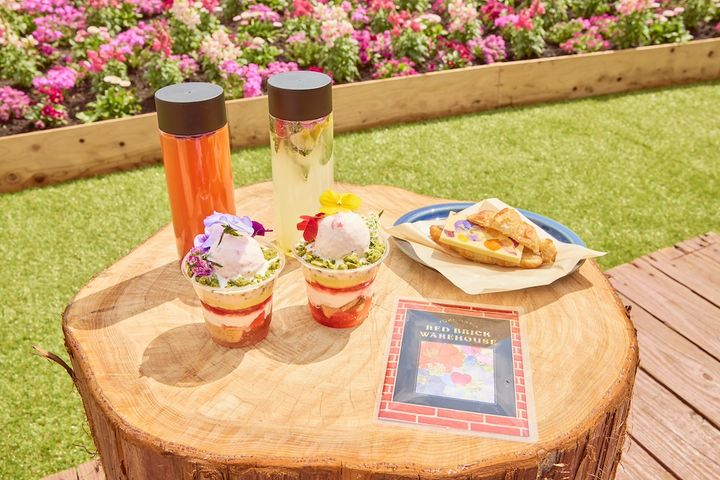 横浜赤レンガ倉庫 1・2号館内のフードコートやカフェ・レストランでは、イベント会場で花を眺めながら食事を楽しめるよう、特別なテイクアウトメニューが充実しています。フードコート内の一部エリアも花の装飾で彩られ、食事の時間とともに春の雰囲気を満喫できます。