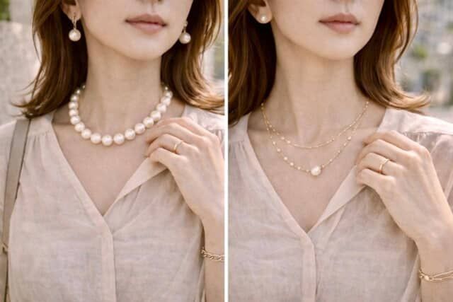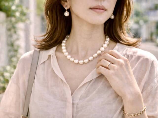 パールは大人世代にとって定番ですが、単体で整えすぎると、ややフォーマルに見えやすい側面もあります。