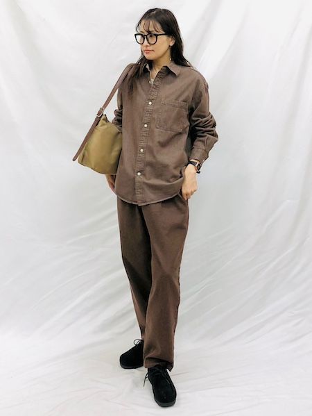 デニムには珍しい、ダークブラウンのデニムキャロットパンツに、同じブラウンのデニムシャツでセットアップ風にまとめたコーディネート。