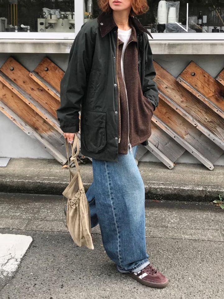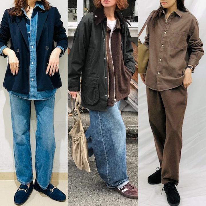 ブルーのデニムに、ブラウン系のアウターやスニーカーを合わせています。ブラウンとブルーは相性がよく、落ち着いた印象でおしゃれ見えする配色なので、大人のデニムコーデにおすすめです。