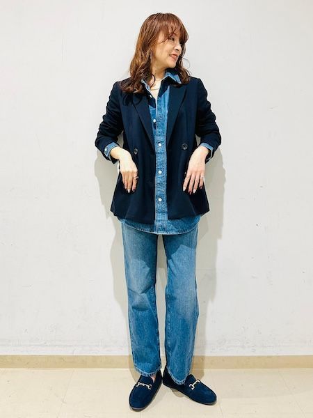 デニムやシャツを含めすべてジーユーでまとめたコーディネートでは、上から同じジーユーの「ダブルブレストジャケット」を羽織り、きれいめカジュアルにまとめています。
