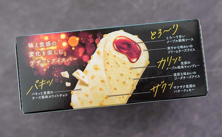 ローソン限定で発売された本商品は、“とろっ×ザクッ×カリッ×パキッ”のさまざまな食感を一度に楽しめるチーズケーキアイスです。とろ~り甘いメープル風味ソースと、カリッと食感のメープル風味キャンディー、クリームチーズアイス、ザクッと食感のバタークッキー、パキッと食感のチーズ風味ホワイトチョコの組み合わせとなっています。