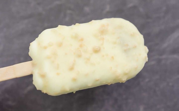 開封したものがこちら。アイスの表面はホワイトチョコでコーティングされています。バタークッキーも混ざっているから、ゴツゴツとした見た目ですね。