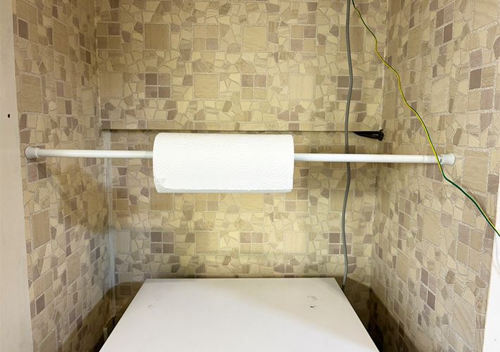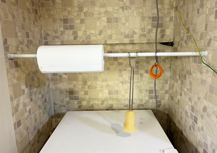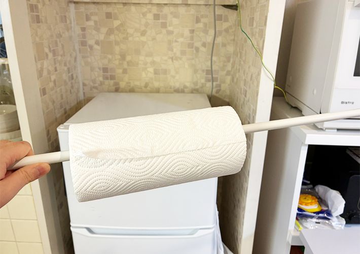 まず、つっぱり棒を掛けられるデッドスペースを見つけましょう。次にデッドスペースの幅に掛けられるサイズのつっぱり棒に、キッチンペーパーを通してください。