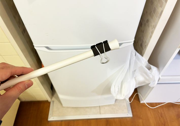 まず、つっぱり棒の先端に、大きいサイズのクリップを挟みます。筆者は最大45cmまで伸びるつっぱり棒を使用しました。