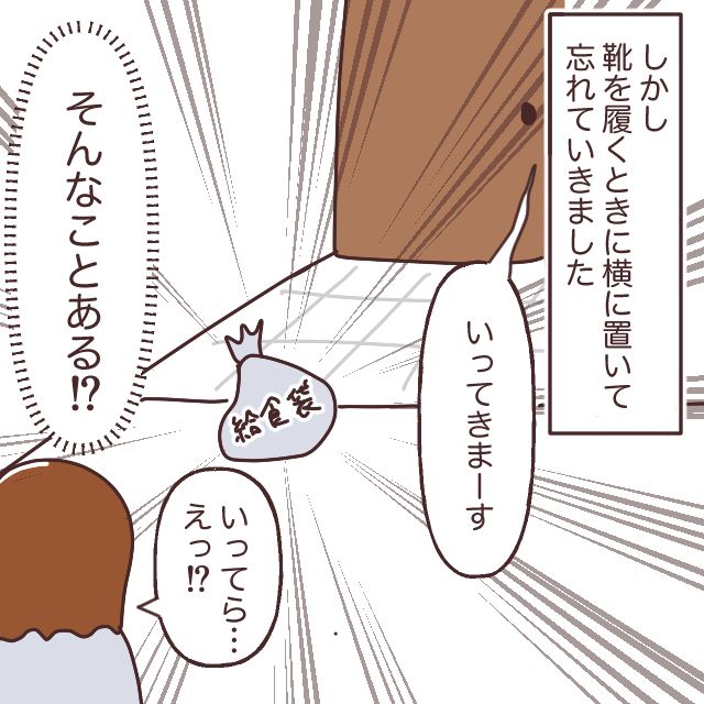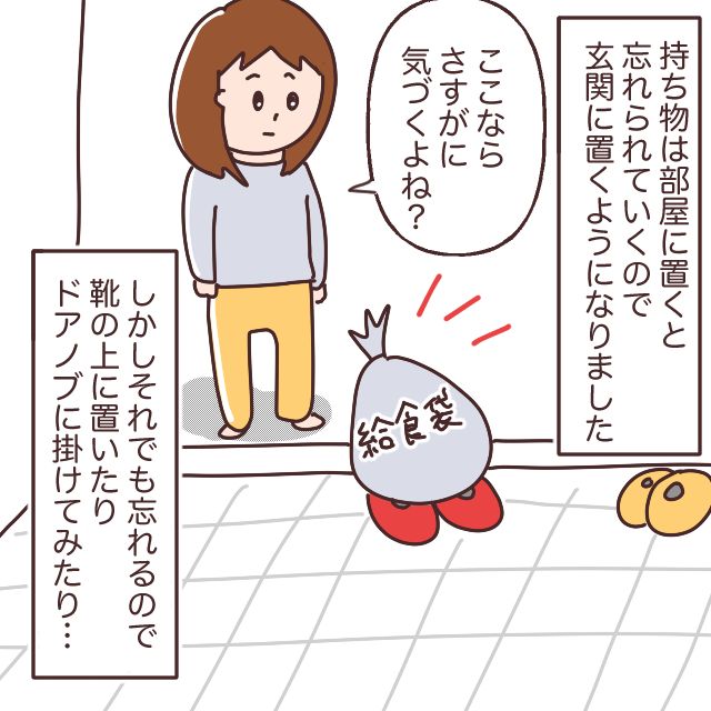 しかし、どんな手を打っても忘れてしまうのがうちの息子。この日も、絶対忘れないようにと靴の上に給食袋を置いたのですが、なんと靴を履くときに横に置いて、そのまま忘れて出て行ってしまったのです。え・・・そんなことある!?