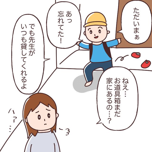 すると、タイミングよくトウマが帰ってきました。私はため息をつきながら、「ねぇ、お道具箱まだ家にあるの?」とたずねると、トウマは少しも悪びれる様子なく、「あっ、忘れてた!でも先生がいつも貸してくれるよ」と、あっけらかんと言います。