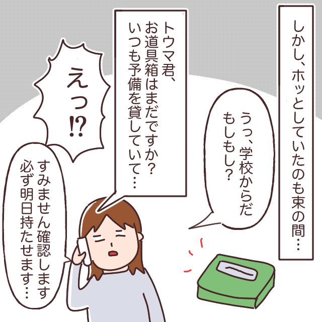 しかし、ホッとしたのも束の間、また学校から電話がかかってきました。恐る恐る受話器を取ると、担任の先生から「トウマ君、お道具箱はまだですか?いつも予備を貸していて」と、思いもよらない言葉が。お道具箱は、購入したその日にトウマの部屋に置いたはず。てっきり学校へ持っていったものだと思い込んでいた私は、思わず言葉を失いました。私は先生に「すみません確認します、必ず明日持たせます」と言って電話を切ります。