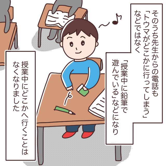 そのうち先生からの電話も、「トウマがどこかに行ってしまう」という深刻なものから、「授業中に鉛筆で遊んでいる」といった、少し落ち着いたものへと変わっていき、私は少しずつ安心できるようになったのです。