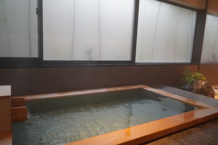 バスタイムの楽しみのひとつが、チェックイン時に選べるホテルオリジナルのバスソルト。Bamboo、Moon、Yuzu、Hinokiの4種類が用意されており、実際に香りをたしかめて選べます。今回は一番人気だというBambooをチョイス。檜風呂から立ち上る檜の香りに、湯船に溶け込む竹のフレッシュな香りが重なり、思わず深呼吸したくなる心地よさです。