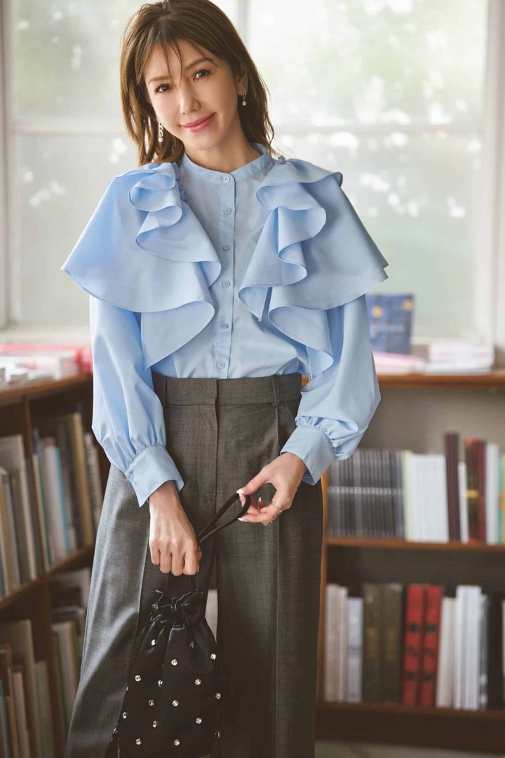 華やかなラッフルブラウスが、シンプルなグレーパンツを一気に格上げ。顔まわりにボリュームを出すことで視線が上がり、上品な華やかさとすっきり見えを同時に叶えます。