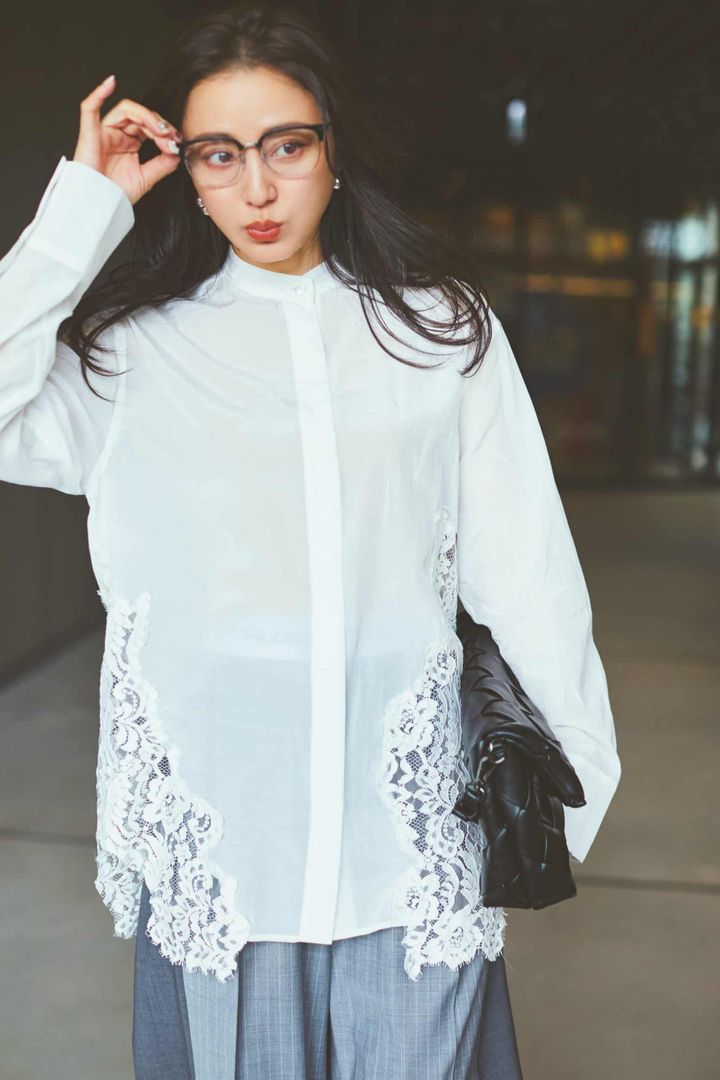 繊細なレースとアシンメトリーな裾が、動きに表情をプラス。ほどよいゆとりと軽やかな素材で、着るだけで洗練された印象に。グレーパンツと合わせて甘さを整え、大人っぽく着地。