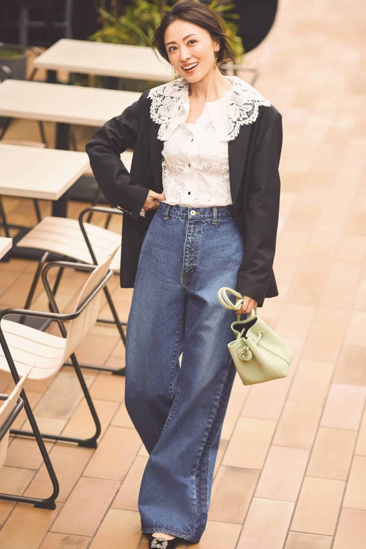 大きな甘レースの襟が目を引くブラウスが、デニムスタイルをぐっと格上げ。黒ジャケットで引き締めることで甘さが程よく抑えられ、気負わず着映える大人カジュアルに。