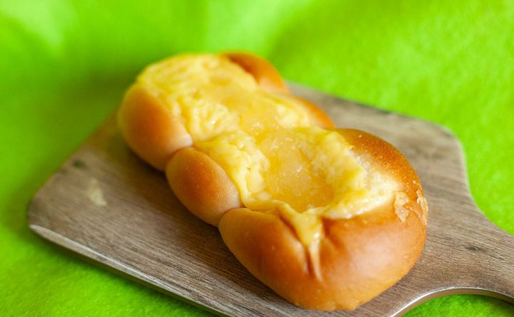 念のため、半分に切ってみたのがこちら。カスタードは天面にのっているだけで、中に何かが入っているわけではなさそうです。まぁ、何かを入れるだけの厚みもありませんしね。