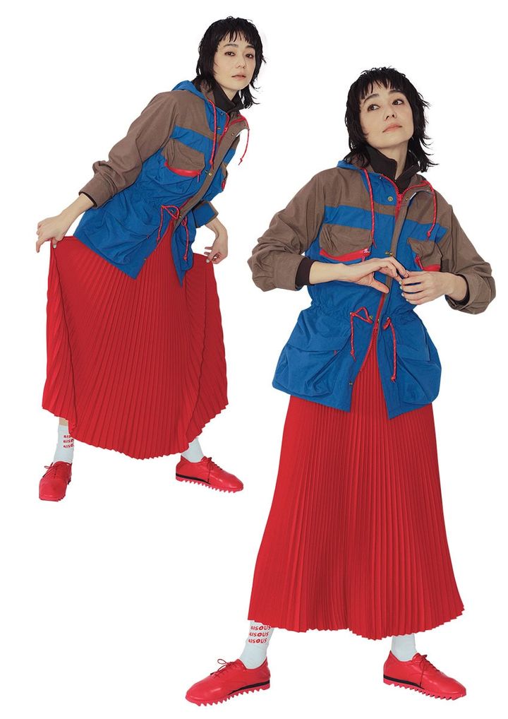 マウンテンパーカ¥209,000、トラックジャケット¥132,000(共にマディソンブルー)、スカート¥39,600(ハイク)、シューズ¥81,400(ビューティフル シューズ×ハイク/共にボウルズ)、ソックス¥3,850(ビズスケートボード/サードマガジン)