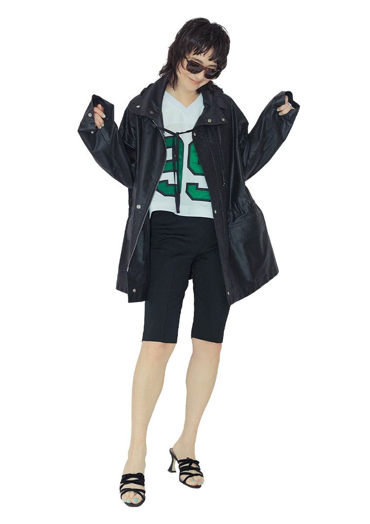 ブルゾン¥170,500(バウト)、ドレス※ジップを外してTシャツとして使用¥31,900(ナナナナサーカ別注/RHC ロンハーマン)、スカーフ¥16,500(マージ/マルティニーク ルミネ横浜)、パンツ¥16,940(イウエン マトフ/エディット ユナイテッドアローズ 梅田店)、サングラス¥23,800(カリン/スタードリーム ジャパン)、サンダル¥169,400(マノロ ブラニク/ドゥロワー 青山店)
