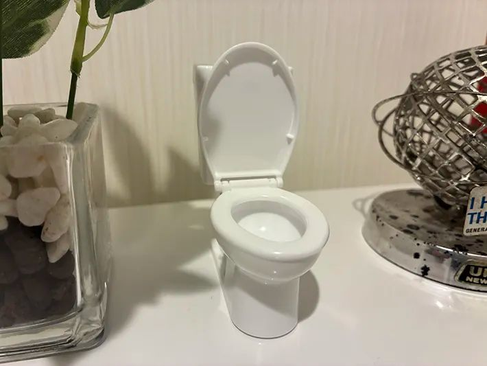 手のひらに収まるコンパクトなサイズ感で、パカッと開く便座が本物のトイレのようにリアルです…!