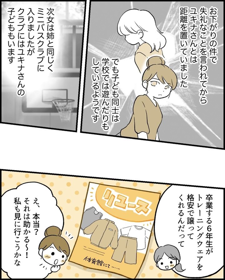 次女は姉と同じくミニバスクラブに入りましたが、そこにはユキナさんの子どももいます。卒業生が格安でトレーニングウェアを売ってくれるというので行ってみると、冷やかしのつもりなのか、お下がりを否定していたユキナさんの姿があったのです。