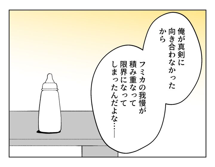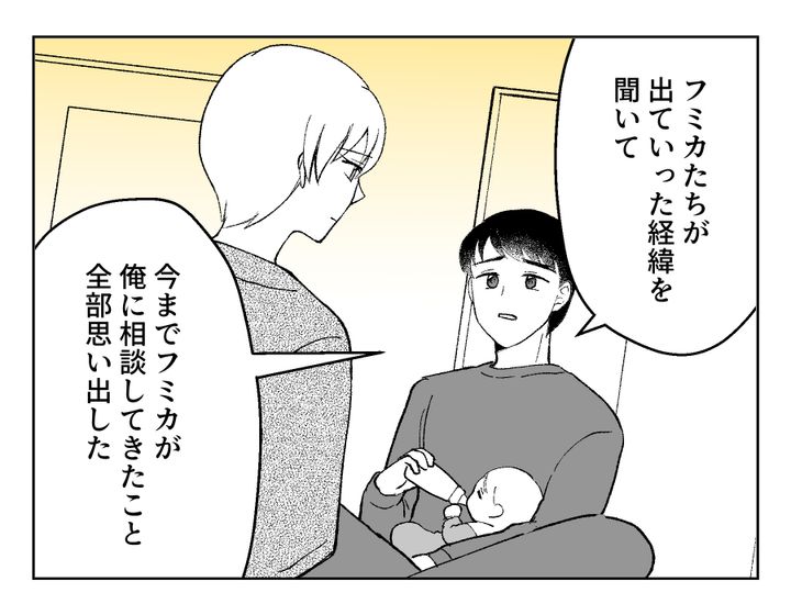 フミカさん(25)は同じ職場で出会った整体師のコウセイさん(25)と妊娠を機に結婚。妊娠直後からひどいつわりに苦しんだフミカさんは、身寄りもないので義実家にお世話になることになりました。大変な産前産後を温かくサポートしてくれた義両親に対して、フミカさんは感謝の気持ちでいっぱい。しかし同居生活において「トイレの流し忘れ問題」「消毒液の空き容器でご飯に水をスプレー問題」などいろいろな不満も。ついに耐えきれなくなって家を飛び出し、友人のもとへ。話を聞いてもらいながら、別居を決意。帰りを待っていたコウセイさんから謝罪され、コウセイさんの方から別居を提案されました。
