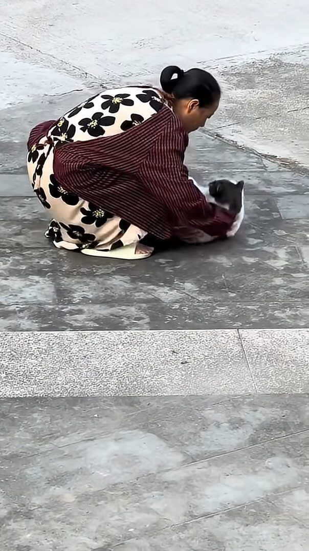 外でのびのびくつろぐネコ。 そこにやってきたママさんは、この子を慣れた様子で抱きかかえるとそのままお家へと運んでいくのでした!