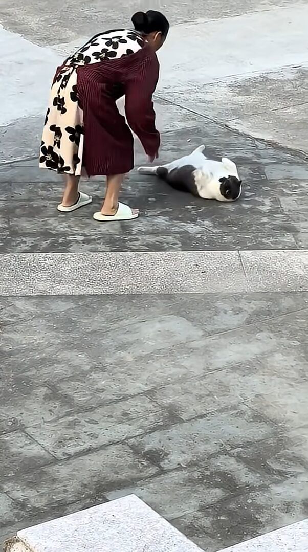 道端でゴロリと横になっているネコ。 なかなかまんまるに成長したこのネコの前に、飼い主さんと思われる女性がやってきました。