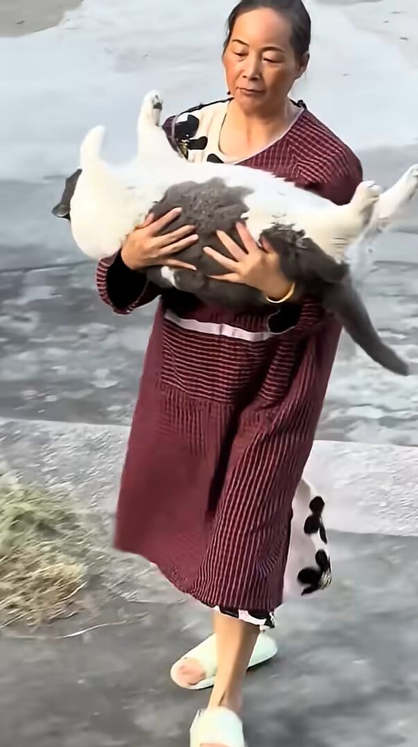 そんなネコの事を女性は「どっこいしょ」とばかりに抱きあげました。 なかなかに大きな子なので、抱きかかえるのは大変そうです。