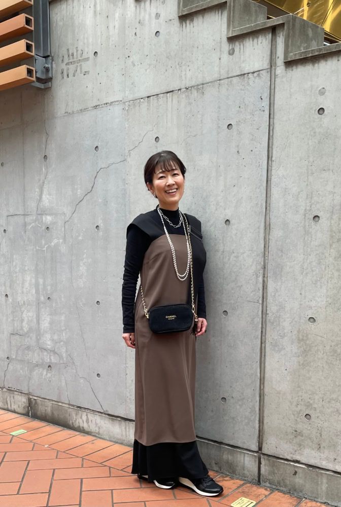 「スニーカーイベントなので着心地のよさを重視しながらも、きちんと感を意識しました。お気に入りの『シソラス』のサロペットを主役に、そのほかはブラックでまとめ、小物で華やかさをプラス。シンプルな中にもデザイン性があり、気分が上がるアイテム選びをしています」
