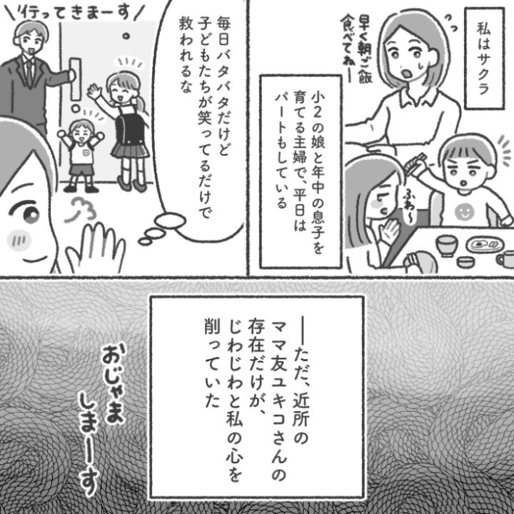 主人公は小学校2年生の娘と幼稚園生の息子を育てるお母さん。毎日幸せですが、主人公を悩ませる存在がいて・・・。