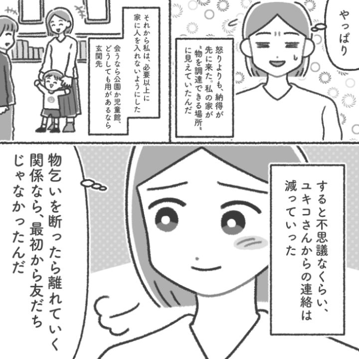 物乞いができなくなったと判断したママ友はあれ以来主人公の家にやって来ることはなくなったのでした。