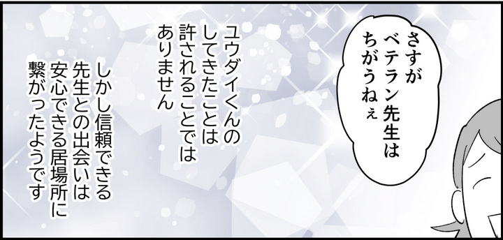 でも授業参観で生き生きと授業に参加するユウダイくんを見て、私はユウダイくんが信頼できる大人に出会ったことに気づきました。