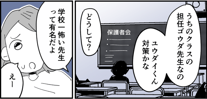 これまでマホちゃんの担任だった先生は学校を辞め、厳しいことで有名なゴウダ先生が息子たちの担任になったのです。