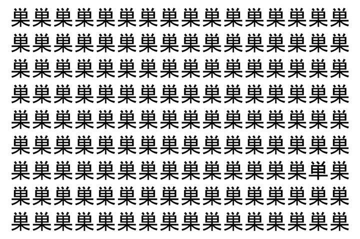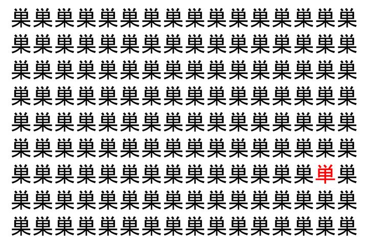 画像の中には、「巣」という漢字が縦に9行、横に16個並んでいます。 全部で144個となりますが・・・、そのうち1つは「異なる漢字」となってますよ!!