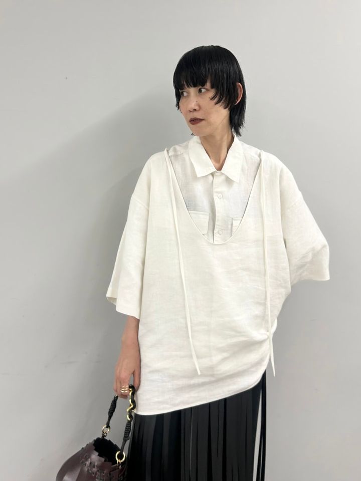 「メインで着ている外側のシャツは、ギリギリミニワンピースで着られる丈と、大きいUネックのあきが今の気分にピッタリで気に入っています。もう少し暖かくなったら、シアースカートやバイカーパンツの合わせも楽しむ予定です」シャツ¥30,800(GALLARDAGALANTE)、中に着たシャツ¥35,200(DHRITIE/共にGALLARDAGALANTE青山店)