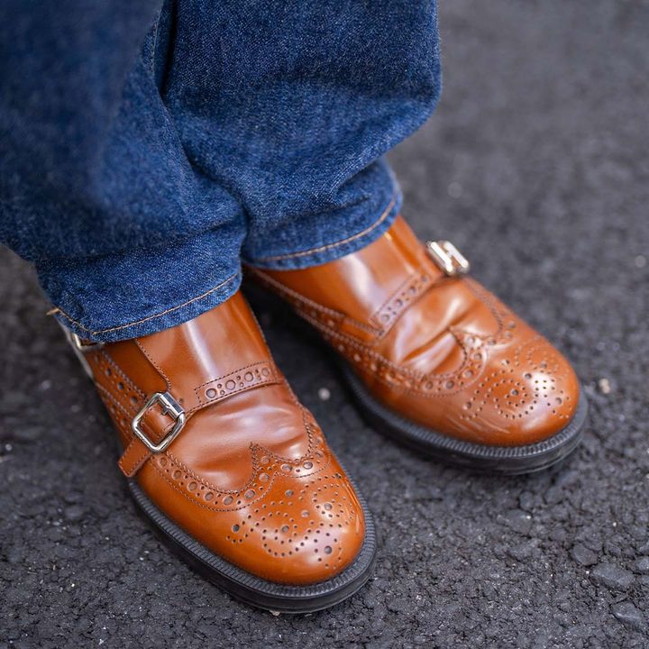 『ミュウミュウ』のシューズはウイングチップのディテールが目を引く逸品。インディゴのデニムとも好マッチなスタイリング。