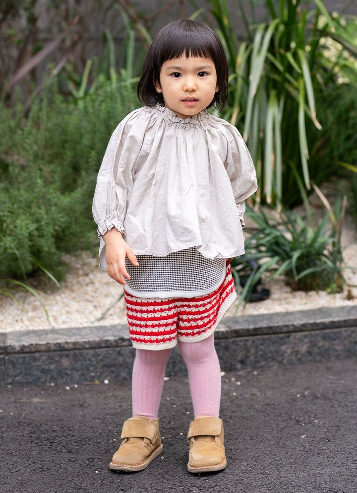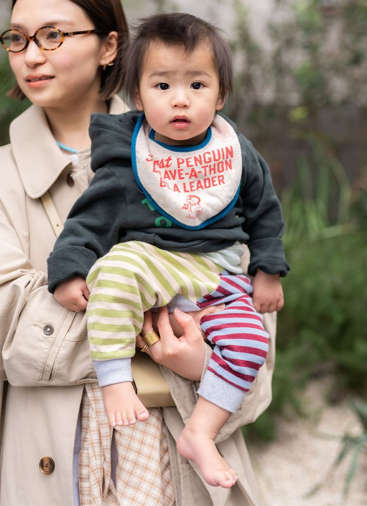 ストリートなフーディーにカラフルなボーダー柄ボトムスを合わせた、クールなベビーコーデが登場! ポップなスタイで遊び心も忘れずに。