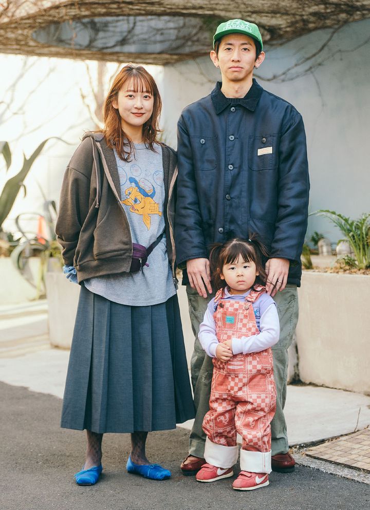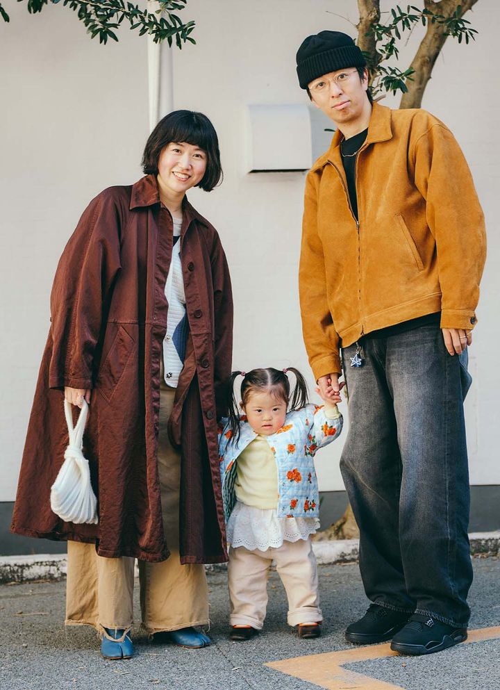 NAME:ショウコさん&チカラさん、ヤエちゃん・2歳夫婦でブラウンアウターを着こなし、ヤエちゃんのお花柄アウターでアクセントをプラスしたファミリーコーデ。ママはきれいめにまとめつつ、ダメージ感のある『ウーア』のボトムでこなれた印象。パンツにスカートをレイヤードしたヤエちゃんの着こなしも、トレンド感たっぷりで目を引くポイント。item▼