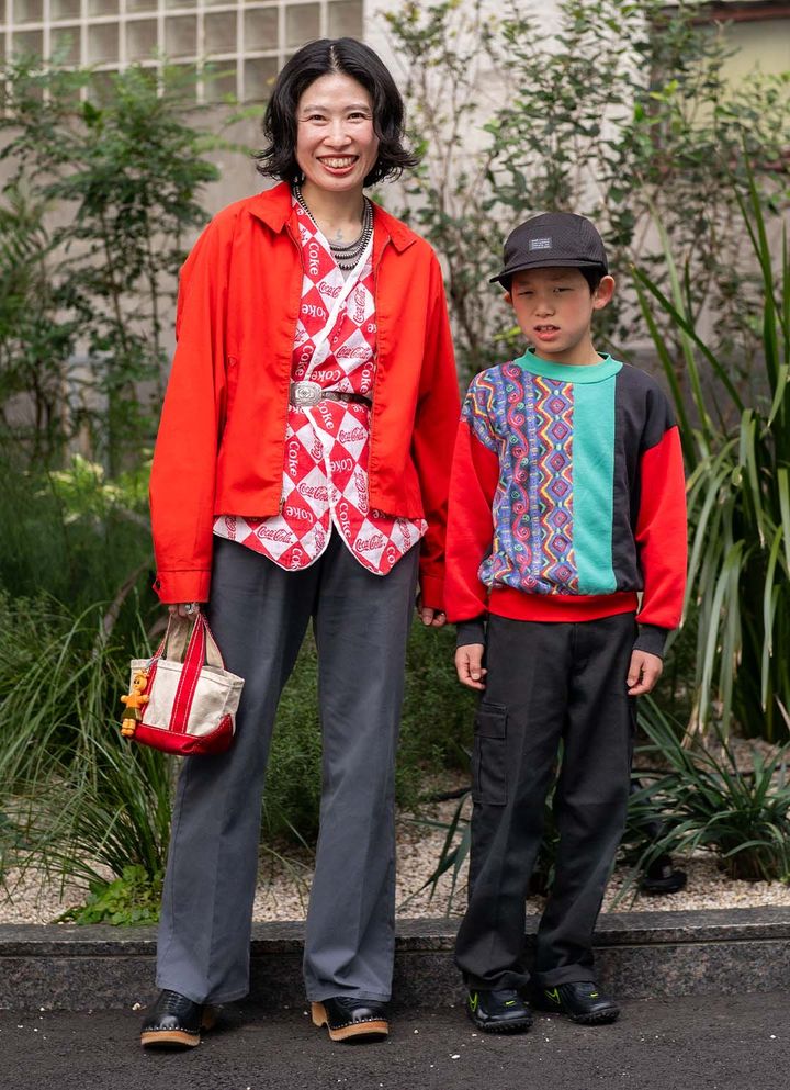 NAME:YUIさん&皐月くん・8歳鮮やかな赤が2人を繋ぐカラーリンクがお見事! 遊び心たっぷりな「Coke」のロゴが目を引くジレに、鮮やかな赤アウターを羽織って、キャンバストートを添えたママ。皐月くんは、配色プリントのスウェットにキャップを合わせて大人っぽい雰囲気に。難易度の高い赤を取り入れ、さりげなくリンクさせた上級テクニック。item▼