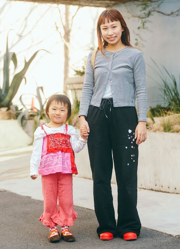 NAME:あらいまいさん&ゆらちゃん・3歳赤やピンクのバンダナを組み合わせたパッチワークキャミを主役に、フリルのパンツ、お花柄ソックスで陽気なムードに仕上げたゆらちゃん。ママは、カーディガンやボトムをブラックベースでシックにまとめつつ『ハンター』の赤シューズでアクセントをオン。異なるテイストもカラーをリンクさせてまとまりのある母娘コーデに。▼item