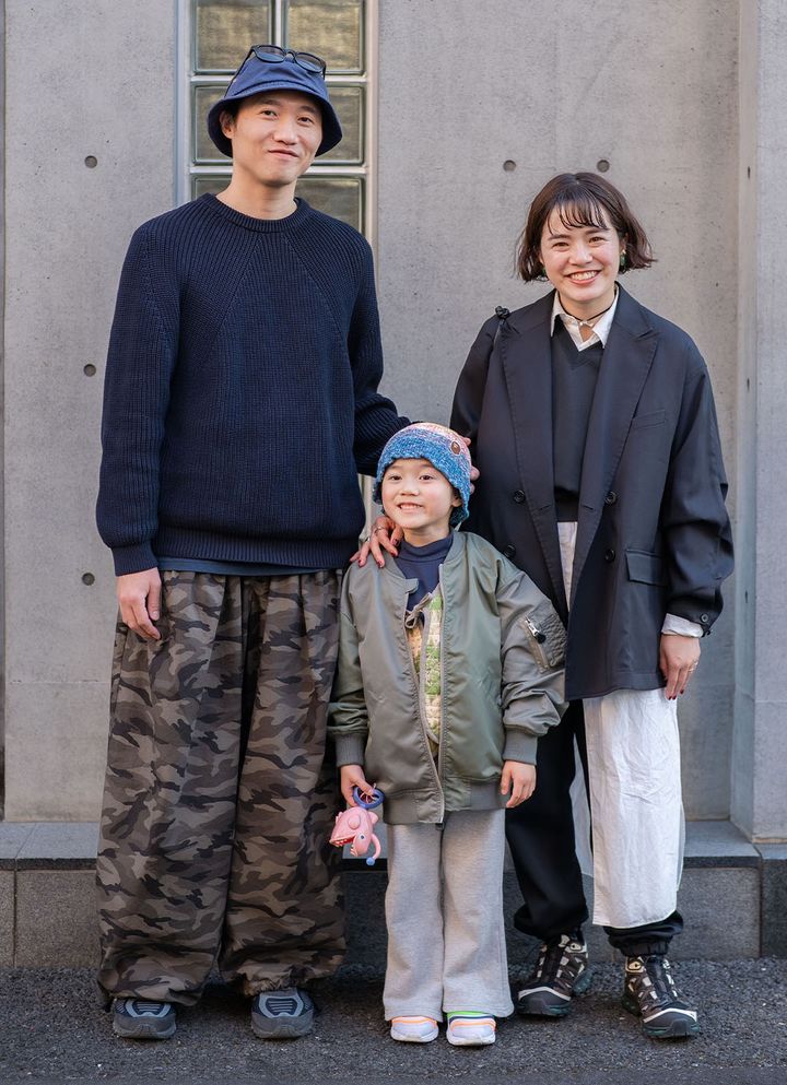 NAME:今成春香さん&今成一崇さん、ようたろうくん・5歳ほどよいカジュアルさと品の良さが交差する今成ファミリー。きちんと感のあるショートトレンチにラフなスウェットパンツを合わせてカジュアルダウンしたママ。オーバーサイズのMA-1にスウェットパンツを重ねたようたろうくん。ボリューミィな迷彩ボトムで存在感を放つパパ。3人の個性を引き立てたリラックスムードが魅力。item▼