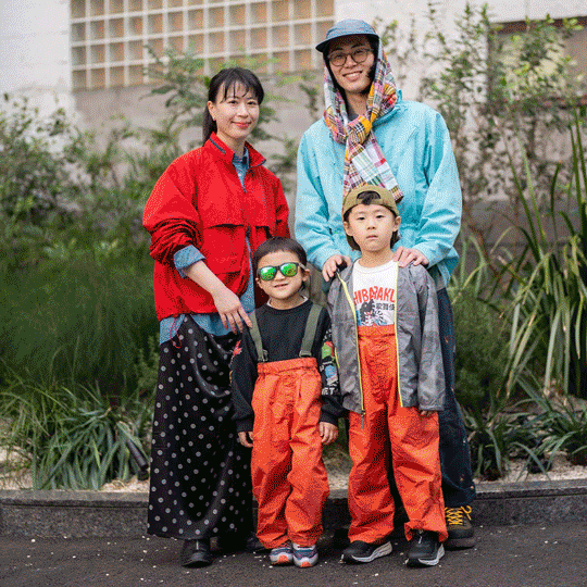 NAME:うにさん&ゆうたさん、ときくん・6歳、さくくん・4歳ときくんとさくくんは『マーキーズ』の鮮やかなオレンジボトムをオソロで、ママは真っ赤なアウターを、パパは爽やかなライトブルーのパーカを主役にしたカラーミックススタイルを堪能中。異なるカラー使いも、アウトドア感のあるシャリ素材をリンクさせることで、一体感のあるファミリーコーデに。item▼