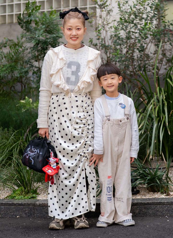 NAME:優意さん&といろくん・7歳華やかなラッフルブラウスに、アシンメトリーなフリルギャザーがポイントのドット柄スカートを合わせたママ。といろくんは、サスペンダー付きの『ペイデイ』のボトムでお茶目に仕上げて。バッグやヘアアクセはブラックで揃えて、コーデ全体を引き締め。ちょっぴりボヘミアンなムードが漂う、軽やかで春らしい着こなしに脱帽♡item▼