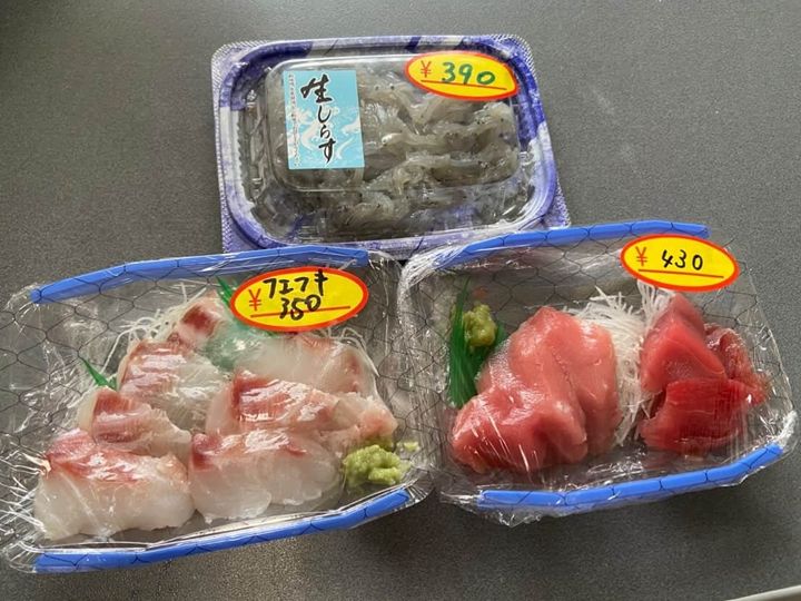 今回私は、刺身の盛り合わせと生しらすをいただきました。300円台〜500円台で購入できる刺身の盛り合わせが多く、安さにびっくりしました。