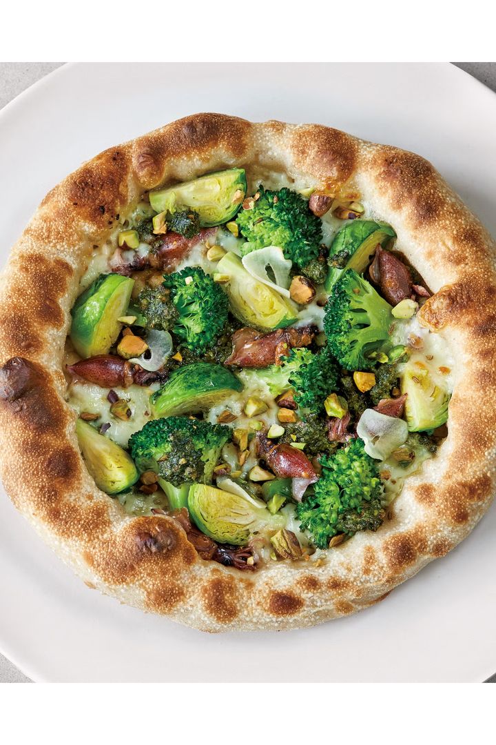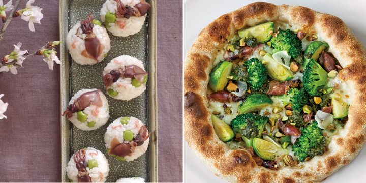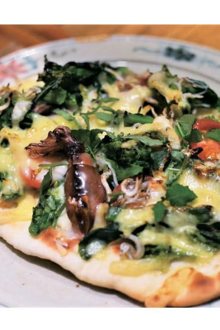 薪火料理をメインに据えるビストロ、「songbook」の直伝レシピ。旬の食材をたっぷりのせたごちそうピザは、フライパンでふんわりと焼き上げてから、オーブンで香ばしく焼き色をつけることで、ピザ窯を使わなくてもおいしく仕上がる。ほたるいかのうま味と春菊ペーストのほろ苦さが相まって、ワインを呼ぶ味わいに。