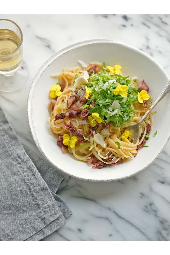 にんにく香るオイルパスタに、セロリのさわやかな風味をプラスして軽やかな印象に。ほたるいかの濃厚なうま味が麺に絡み、ひと口ごとにワインが進む。仕上げに菜の花を散らして、春らしいプレゼンテーションに仕上げよう。