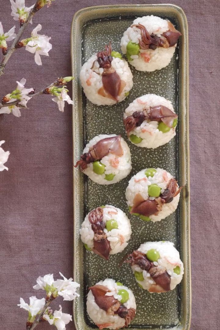 ころんとしたフォルムが愛らしい手毬にぎり。桜の塩漬けを炊き込んだご飯に、グリーンピースのほっくりやさしい甘み、ほたるいかのうま味が好相性。日本酒やビールと一緒に味わいたい。