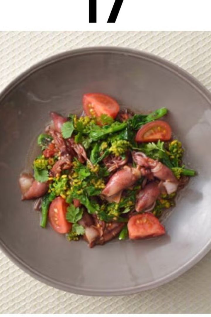 ほたるいかとトマトのうま味が重なる煮込み料理。やわらかな春キャベツが、トマトのコクをしっかりと受け止める。山椒を効かせたマヨネーズソースで軽やかに仕上げるのがポイント。余ったらパスタに絡めて楽しむのもおすすめだ。